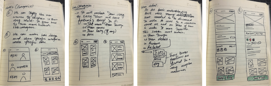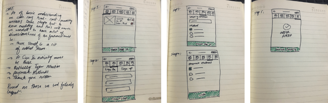I started of by mapping a simple user flow of the application which was then turned into low fidelity mock up (Sketches). I designed multiple variations of the designs some of them were not so great and some of them were mixed together to create new experiences.