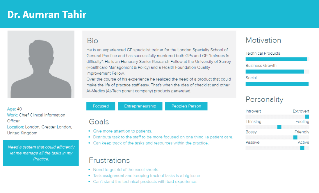 We did a detailed interview with Dr. Aumran Tahir to get to know how practices work and what is he expecting from the product. Based on that a basic user persona was created that clearly shows his Goals, Frustrations and Personality.