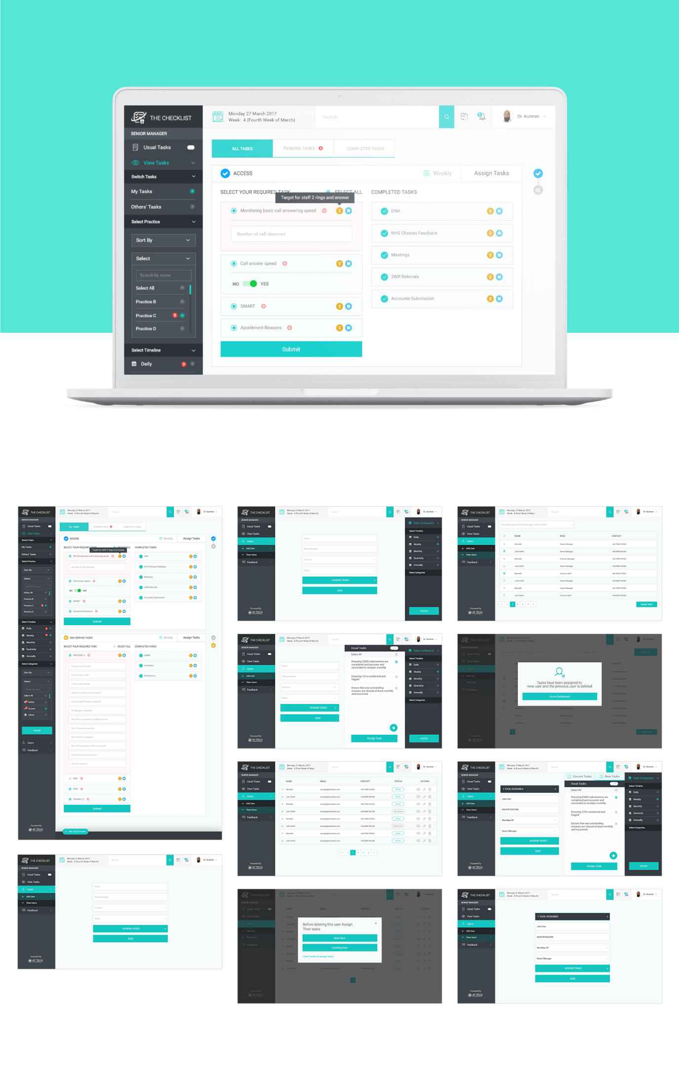 Design an application that help the staff of practices to perform their task more accurately, giving managers full visibility over task delegation, pending actions and completed tasks for one or more practices.